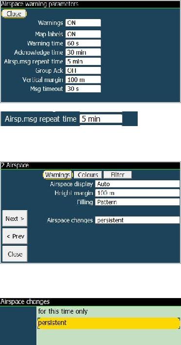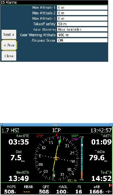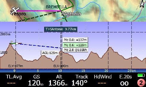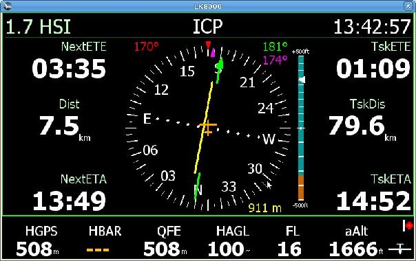 A glide slope bar is shown instead of the VSI if we are at less than 5 NM from the final waypoint. This bar is showing the current angle in degrees to the destination. Three degrees, that is the most common descent angle, is at the center of the scale. This indication becomes quite unstable while getting closer to the runway so when at less than 1.5 Km the glide slope bar disappears and the reminder "VFR landing" starts blinking on the top. The software uses also the runway length (if available from the CUP waypoint list) to calculate the descent angle to the beginning of the runway. This feature is meant just as an indication and should be used only during VFR flights.